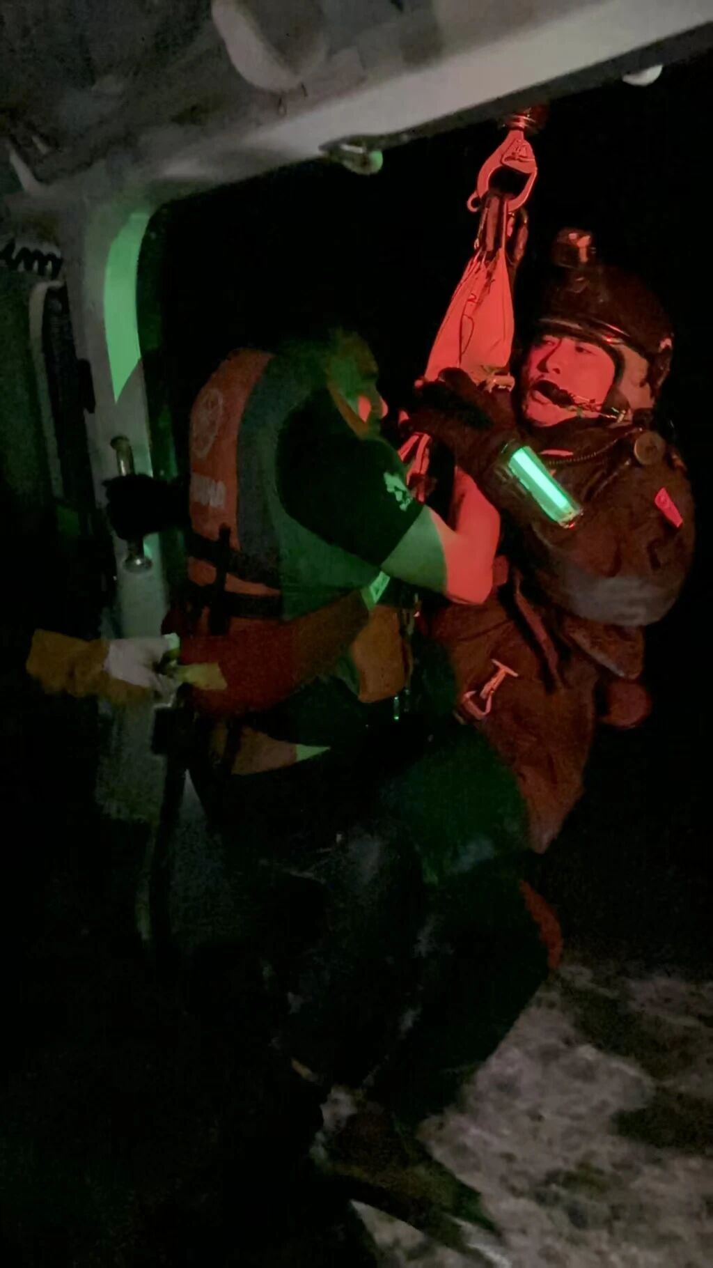 次日凌晨,在珠海基地值守的“B-72CT”救助直升机起飞前往救助。“B-72CT”救助直升机抵达事发海域后,救生机组很快发现了目标渔船,现场海面风浪较大,搁浅的渔船船尾竖着高高的桅杆,且堆满杂物,吊运作业空间狭小,加之遇险渔民头上携带探照灯,光线太强严重影响机组人员视线,这些都给夜航救助带来极大挑战。机组决定采用盲吊救援技术,立即协调渔民关闭探照灯,机长在渔船上空稳定悬停,救生员在绞车手操纵下顺利降到渔船船尾。机组人员凭借过硬技术和默契配合,克服暗夜视野受限、吊运作业无参照等困难,成功将3名遇险渔民接上直升机,返回。最终,“B-72CT”救助直升机落地金湾机场,3名遇险渔民成功获救。