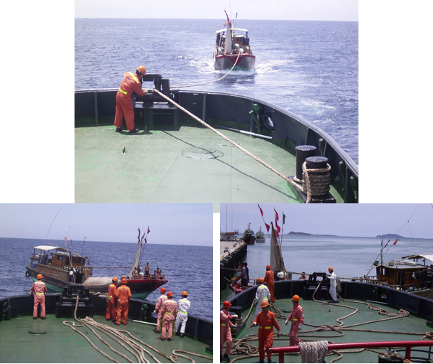 “南海救198”发现渔船有人招手求救,立即慢车靠近,了解情况后,马上展开救助,接拖“三亚港L152”。2小时后,将遇险渔船及船上7人安全拖抵三亚基地码头。