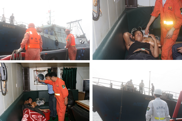 1000时,“南海救196”奉命接上医生和护士各1名后从三亚起航前往救助;1445时,在三亚以南50海里处与渔船会合,顺利接上1名病人和1名陪同人员后立即返航。
