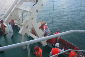 开救助行动,施放救助艇前往搜救,