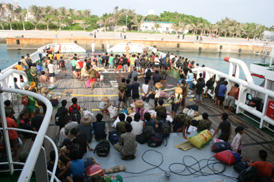 1620时“南海救111”轮搭载获救渔民并护航两艘小艇安全抵靠永兴岛部队码头,将全部获救渔民(共141名)和两艘小艇移交给边防派出所安置。