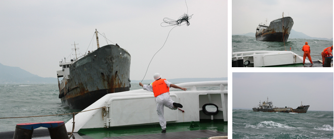 1430时“南海救115”轮赶到现场,一举成功接拖,由于遇险船破旧漏水,现场风大浪高,救助船决定将遇险船“顺泰”轮先拖往铜鼓咀安全海域。