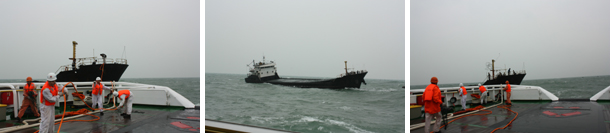 2011年1月17日早上,装载900吨散装水泥的货船“西南3”轮,在海南海口湾西北约6海里处螺旋桨被渔网绞缠失去动力遇险,船上6人,请求救助。
