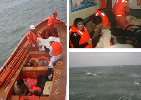 0943时,“南海救197”奉命从企沙港赶往救助;1015时抵达现场没发现遇险船,“南海救197”随即展开搜寻,1025时,在距救助船约0.3海里处的海面上发现有几名穿着救生衣的落水人员抱成一团,在波浪下时隐时现,现场风力7级,阵风8级,气温摄氏5-6度,时间就是生命,救助船立即施放救生艇,携带御寒棉胎前往施救,1050时成功将被冻僵、意识模糊的4名落水人员逐一救起(两男两女,后经咨询证实是“粤中山货8003”人员,该船已沉没),1100时,救助船又在相距约0.3海里处发现并救起最后1名落水遇险者,虽经全力抢救,但已无生命体征。