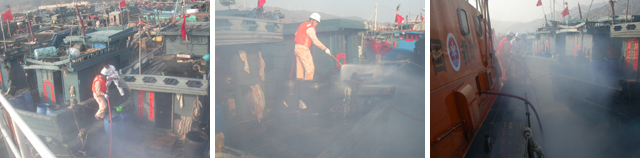 2011年2月3日(大年初一)1550时,在汕头南澳值班的“华英392”艇发现云澳渔港内有一艘渔船冒起浓烟。