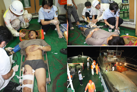 根据局值班室指令, “南海救198”轮接上3名随船医生后,于1915时起航前往现场。 2302时“南海救198”轮与“琼临高10067”会合,迅速将伤员与两名陪同人员接上船后返航三亚救助基地,同时随船医生即对伤员进行紧急救治。