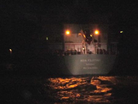 12月11日凌晨,海事人员登上我珠江口值班船“南海救111”轮通报:2艘外轮在珠江口第三分隔带相互发生碰撞,要求救助船立即前往救助和提供必要的支持;0020时,经局救助值班室同意,“南海救111”乘载3名海事人员从桂山锚地前往事发现场;抵达现场了解到,发生碰撞的外轮一艘是马绍尔籍化学品船“HELLESPONT CRUSADER”(136.6×22.6米),装载9185吨芳香烃,22名外籍船员;另一艘是巴哈马籍散货船“AGIA FILOTHEI”(196×32米),22名外籍船员和1名引水员共23人,装载55000吨煤。其中“AGIA FILOTHEI”轮被撞水线下破损进水,左倾,虽然该轮经过自救控制住进水,但由于事发现场风浪较大,其险情并没完全消除,根据现场情况和海事部门的需求,“南海救111”在现场附近实施守护,并为其查看破损情况,协助海事部门对遇险船进行海事调查和必要帮助。直至14日1200时,“AGIA FILOTHEI”轮险情消除自行进港,海事部门通告我局,守护任务才结束。