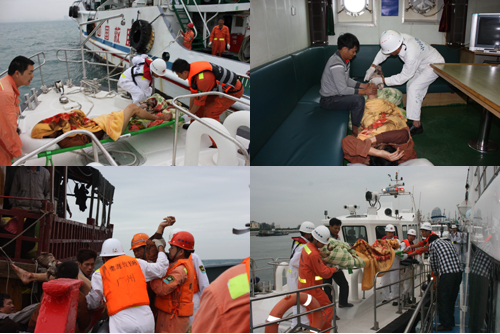 1643时两救助船在三亚鹿回头附近水域汇合,“南海救301”接下伤者迅速返航三亚,1705时抵靠三亚港务局码头,伤者交120救护车送医院救治。