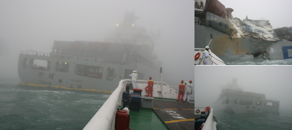 2012年2月22日1748时和1800时,局救助值班室先后从深圳搜救分中心和广东省搜救中心接获信息:均满载集装箱的2艘大型集装箱船“珍河”轮(275×32米,船上25人)与 “MOL MANEUVER”轮(马绍尔籍,长302×42米,21名船员),在2153.3N,11430E(珠江口担杆岛东南约15海里处)发生碰撞,“珍河”轮机舱进水,倾斜3-5度(后经核实“MOL MANEUVER”轮插入“珍河”轮右七舱10米,导致宽25米缺口,两船分开后,“珍河”轮右倾10度),请求救助。 根据险情情况、现场海况、搜救部门的需求及部局指示,1805时和1900时,局救助值班室先后指令“南海救111”轮和“南海救101”轮分别从珠江口桂山和阳江闸坡出动赶赴现场救助。