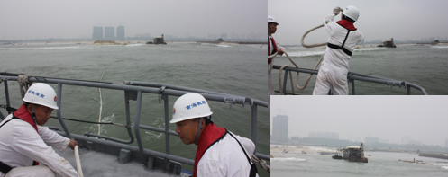 20日1220时,“华英396”艇搭载北海基地应急小分队再次前往现场救助;1325时抵达候潮和提前做相关工作。1530时,“华英396”艇掌握时机迅速接拖,于1600时成功将搁浅工程船拖救出浅,经检查核实,遇险船无破损,人员安全。
