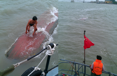 2012年7月23日1215时,汕头基地接汕头边防船艇大队信息:在汕头港5号锚地附近有1艘无名小渔船翻扣,1人站在翻扣的船底上求救。