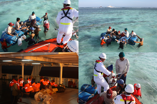 1010时,“南海救115”轮奉命从西沙永兴岛起航前往救助,1540时,“南海救115”到达浪花礁西南面,经现场察看,遇险渔船搁浅在浪花礁环礁湖里的东部,救助船只能施放救助艇从环礁湖的西面入口前往救人,行程约10海里。1650时,“南海救115”施放的救助艇到达距离遇险渔船约150米附近水域,由于现场礁石林立,救助船员只能跃入水中探水引导救助艇谨慎前行,同时,示意遇险渔民通过简易浮箱涉水接近救助艇,再由救助船员将其逐一救接上救助艇。1745时,10名遇险越南渔民全部被救接上救助艇,1925时,顺利将救获的遇险渔民转至救助船,按照部局指示,“南海救115”返航三亚。
