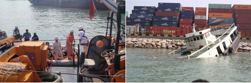 1250时,两艘救助艇先后抵达遇险船现场,“南海救502”首先靠上遇险渔船,经检查发现“珠湾3085”右舷船艏由于桐油灰老化、破裂,产生多条裂缝,船舶仍在不断进水、下沉。两救助艇利用水泵同时进行抽水,但因渔船的裂缝大且多,抽水无法阻止渔船不断下沉。为安全起见,经与船方协商,救助艇放弃抽水,将遇险渔民全部救接到救助艇,1350时,5名获救遇险渔民被救助艇安全送至基地码头;遇险渔船终因进水严重沉没。