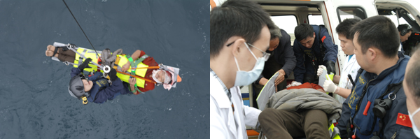 0855时,救助直升机“B-7303”从珠海出动;0923时抵达事发现场;立即将两名受伤渔民及陪同接上飞机;1019时“B-7303”安全降落,2名渔民移交120救护车送医院治疗。