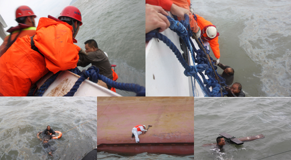 0745时,“南海救116”在沉船点西南方位约0.5海里处发现2名落水遇险人员(2人抱着1个救生圈),随即迅速将其救起。