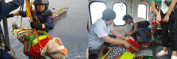 11日0710时,南一飞“B-7136”从三亚起飞;0905时,“B-7136”在永兴岛东南面约25海里处发现遇险渔船,立即开始接救伤员,成功接救3名伤员(1人头部重伤,2人轻伤)和1名陪同,1140时安全降落三亚海军机场,3名伤员交由"120"救护车送往医院救治。