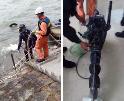 1205时,深圳应急分队出动,1300时抵达现场,潜水员开始下水探摸;1450时将发动机打捞出水,交相关人员任务结束。