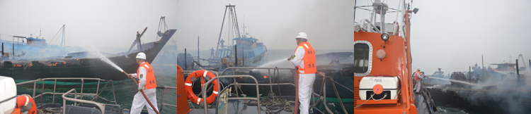 1401时,基地立即指令“华英396”艇出动救助。1450时救助艇抵达现场,火势在蔓延,“华英396”艇靠近失火渔船,进行灭火。