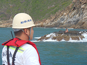 0934时,“南海救301”艇出动,1000时到达现场,发现被困男子,展开救助,1005时成功将被困男子救上“南海救301”艇;检查发现该男子手臂和腿部划伤,没有骨折现象,随即进行应急处理;