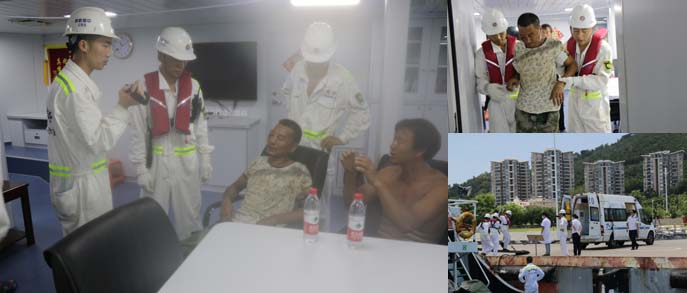 0930时,“南海救203”轮从基地码头出发前往救助。1100时,“南海救203”轮搜寻到该渔船,迅速将2名受伤渔民和陪护人员接到船上,返航。