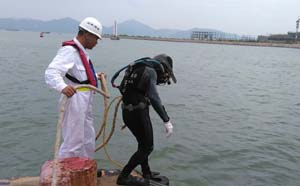1310时,潜水员使用KMB型潜水设备下水对“迅隆贰号”左车、右车车叶进行探摸检查,并按船方要求,协助水下更换润滑油。直至1338时完成所有工作,“迅隆贰号”试车正常。