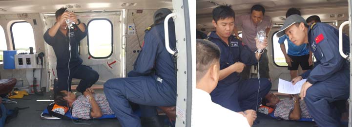 2015年9月20日0910时,西沙永兴岛1名渔民肋骨被缆绳打断,刺破肺部,导致内出血,三沙市海事局请求直升机救助。
