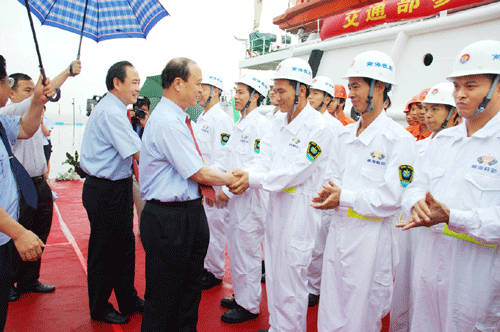 6月3日,交通部在南海救助局广州基地码头举行隆重仪式,热烈欢迎在南海北部海域执行救援越南渔民任务的交通部南海救助局“德进”轮、“南海救