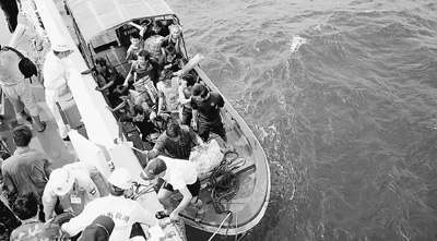 渔民登船也是危机四伏。登上救助船依靠的是船边
