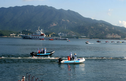 7点30分,按照既定的计划,2条高速救生艇已经从“南海救115”轮放至海面并部署到位,艇上是执行应急救援的“蛙人”和救助队员,他们会在50米以外的地方驾艇巡视警戒,随时注意比赛选手的动向。既要密切跟踪注视每一个选手,又不能激起浪花干扰到比赛,若发生意外,还要尽可能在不影响比赛情况下迅速执行救援行动——这是一个极其艰巨的任务,对驾艇的年轻小伙丁峰来说也是一个巨大的考验。但经过连日来烈日暴雨下的多次训练,他们表现出更多的是用辛勤汗水换来的自信。