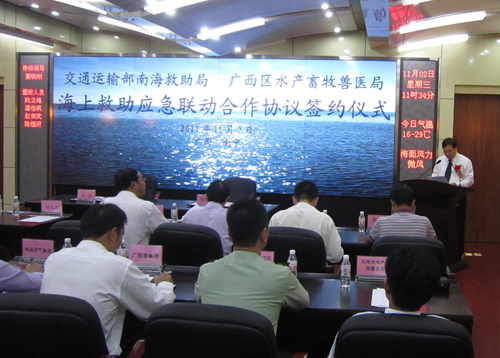 11月2日上午,南海救助局与广西壮族自治区水产畜牧兽医局签署《海上搜救应急联动合作协议》的仪式在南宁市举行。这标志着南海救助局与自治区水产畜牧兽医局的合作进入了一个新阶段和更高的层面。