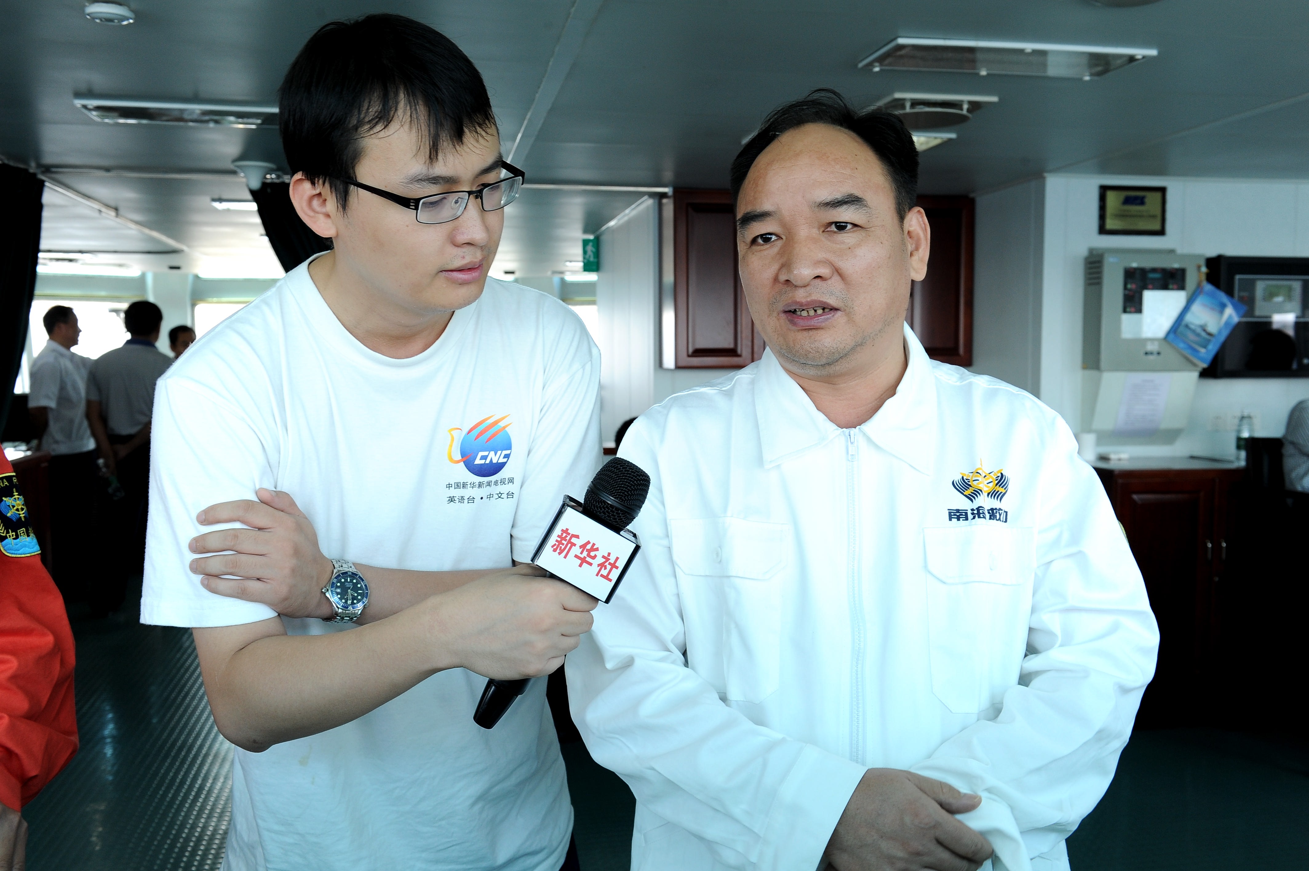 记者们刚吃过早餐,就迫不及待聚集在船舶驾驶室,镜头和话筒对准的是我们的明星船长彭建波。熟悉彭船长的人都知道,他是一从来默默苦干、不擅言辞的“沉默好人”。然而,恰恰是彭船长这份对救助工作的专注和熟练操船的魄力深深的吸引了记者们的目光。只见彭船长一边游刃有余操着舵机,不时用望远镜瞭望远方,一边有条不紊回答着记者连珠炮般的发问,丝毫没有半点不适。
