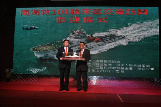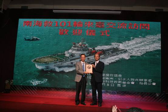 5月8日14时,经过23小时航程后, “南海救101”轮缓缓靠抵台湾高雄港码头,大陆专业救助船再度来台,开展两岸文化交流合作之旅,台湾中华搜救协会在码头举行了隆重的欢迎仪式。