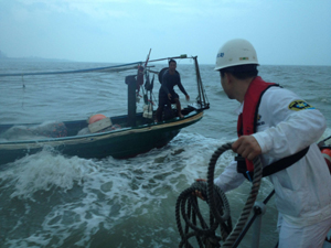 2013年10月16日0638时,在海口市西秀海滩水域离岸约1海里处,1艘无名渔船主机故障、船体进水,船上2人,请求救助。
