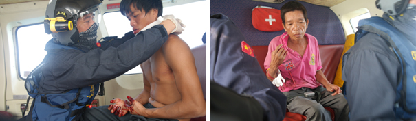 局救助指挥值班获悉立即通知“南一飞”出动直升机救助;0945时,救助直升机“B-7304”从三亚机场前往事发地点,1017时寻获该渔船,此时,受伤渔民经处理流血已止,直升机迅速救接两名受伤渔民上机;1122时,“B-7304”安全降落三亚机场,两名受伤渔民交 “120”救护车送院救治。