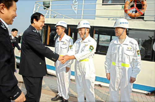 国家亚运安保协调小组组长、公安部副部长李东生亲切看望“南海救609”轮全体船员
