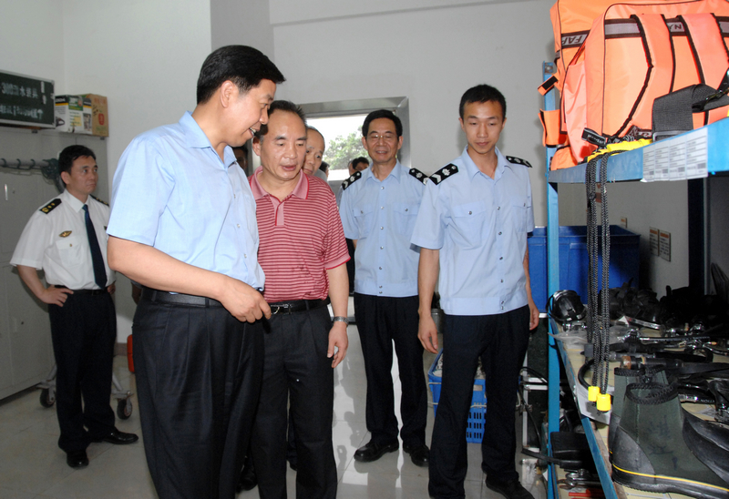 随后,李组长一行视察了基地办公室、码头和救助仓库。在看到潜水仓库摆放齐整的各种应急救助设备时,李组长不断地向身边的潜水应急队员询问设备的使用及保养情况,并指示要管好用好这些设备,发挥应急队的作用。在基地陈列室,李组长望着墙上“危难见真情、此情比海深”、“难忘护送恩,永记救助情”、“赤坎水库抢险重大贡献”等锦旗,高兴地说:“你们的工作获得了政府和人民群众的认可,要继续努力,为海上安全和地方经济多做贡献!”
